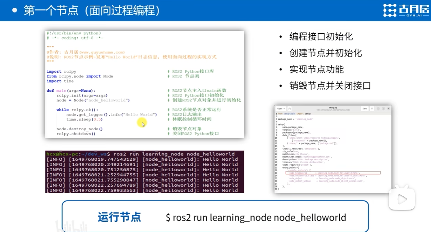 """ @作者: 古月居(www.guyuehome.com) @说明: ROS2节点示例-发布“Hello World”日志信息, 使用面向对象的实现方式 """