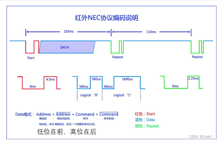 NEC编码包括地址码和命令码,其中地址吗和命令码都会进行一次反码校验。因此,一段完整的NEC数据码一共有4个字节,32位bit