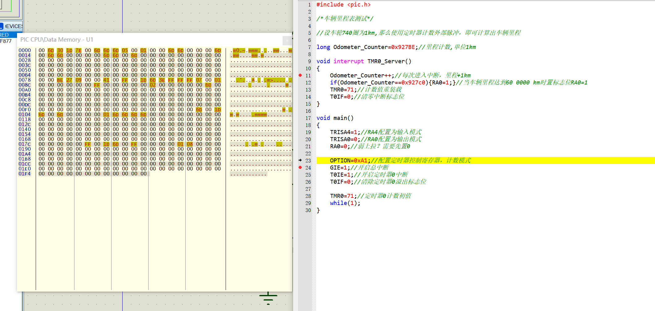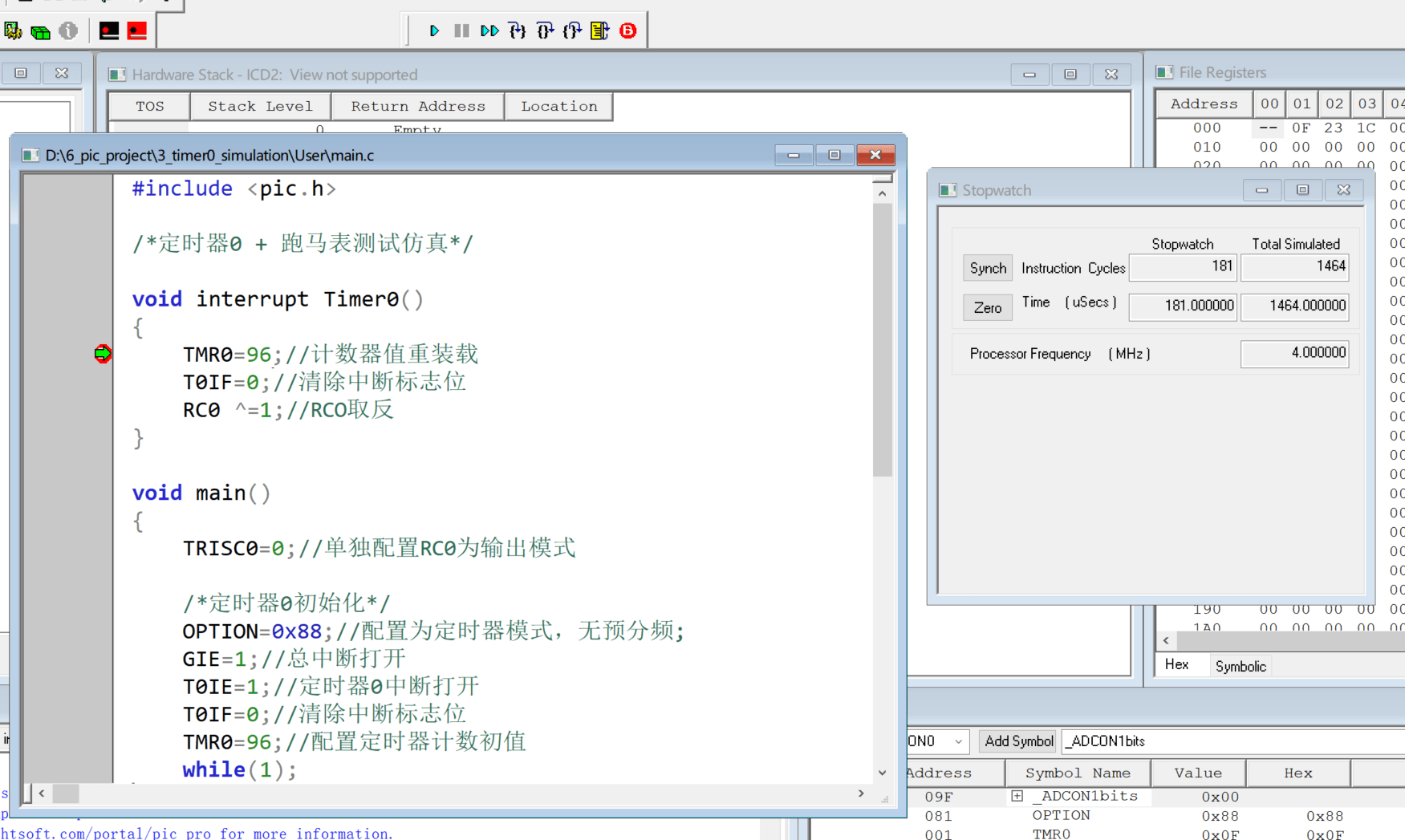 在DEBUG下选mplab sim后,再点DEBUGSETTING来设好频率,设好后点stopwatch