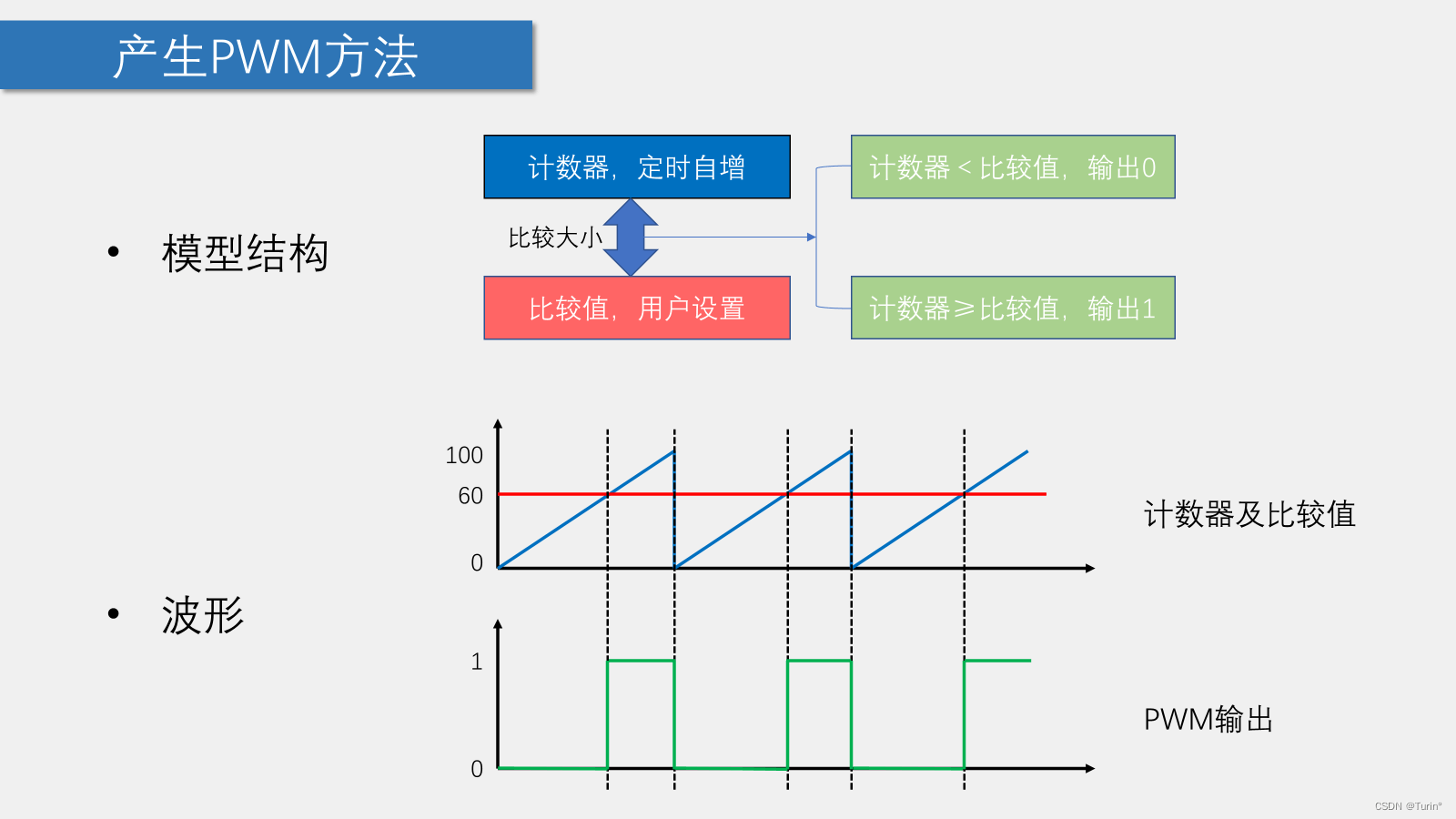 - PWM重要参数: 频率 = 1 / TS 占空比 = TON / TS 精度 = 占空比变化步距