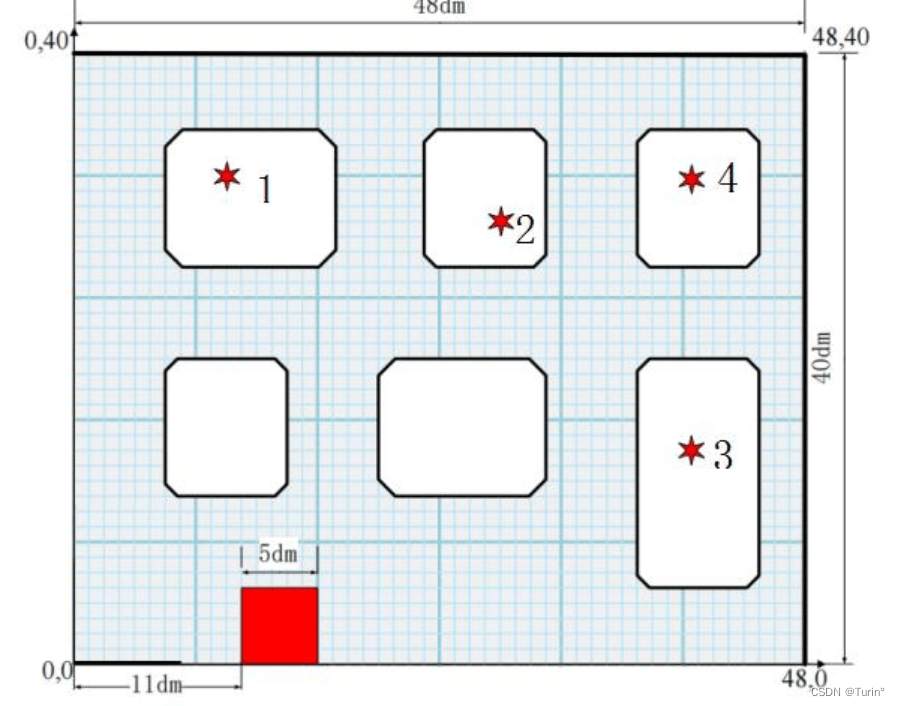 - 可能出现的火源如图所示的 1、 2、 3、 4。 当消防车接收到火源地点位置信息即刻前往熄灭火源, 消防工作完成时间越短越好。 其中白色部分是街区, 消防车不得驶入, 红色区域是消防车停车点。