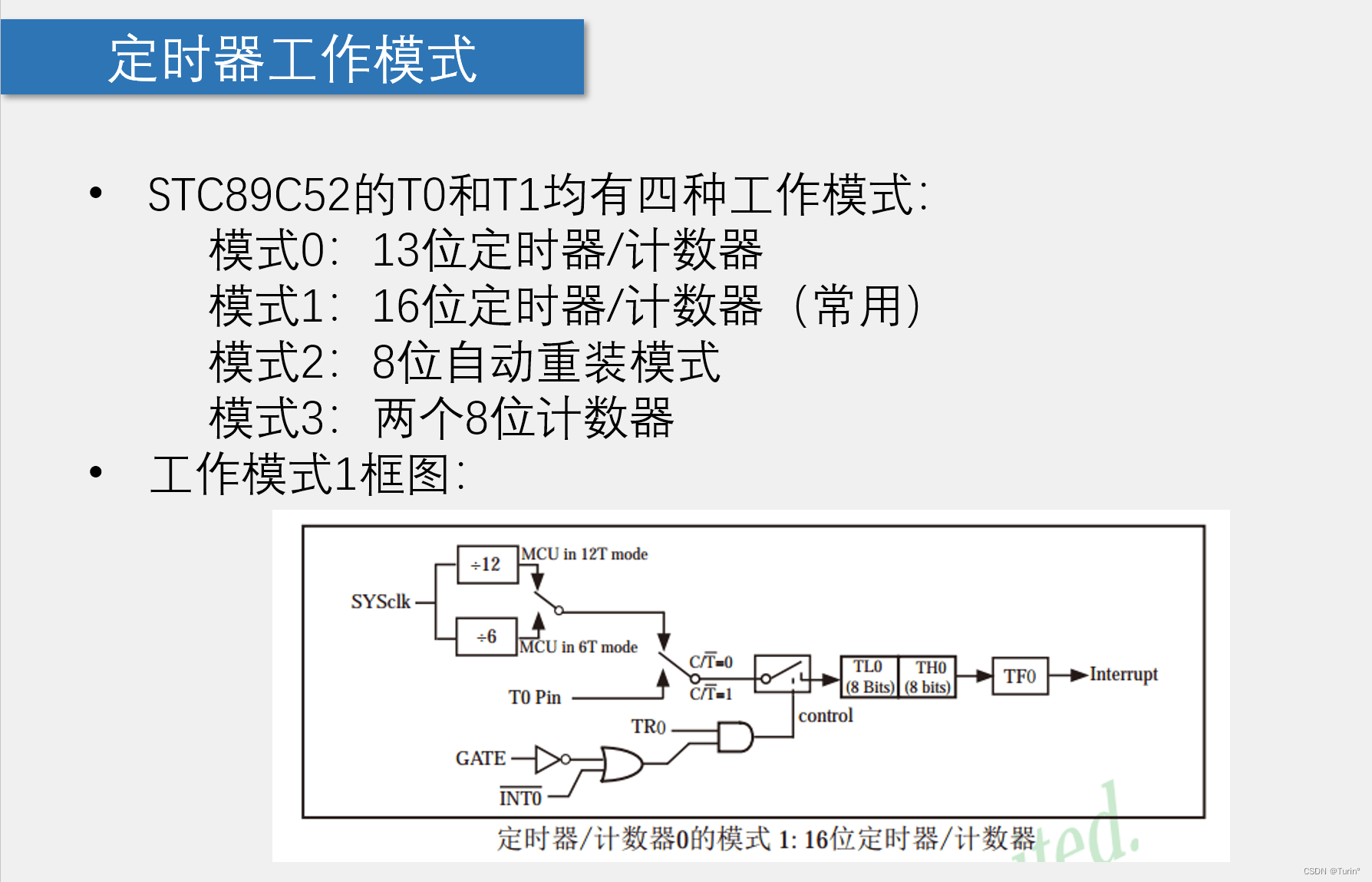 - 注意:当时钟源为外部(T0)引脚提供时,定时器作为“计数器”作用,当外部每输入一个脉冲信号,计数器计数加一(不是常用功能)。