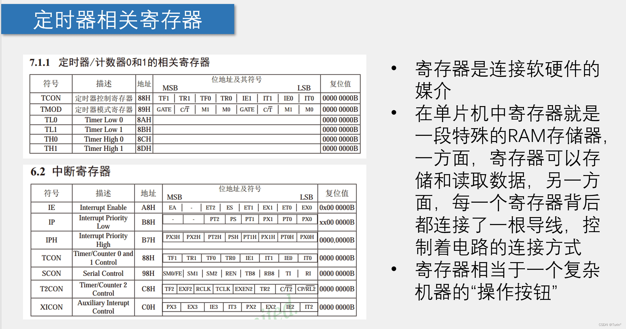 - 寄存器相当于连接单片机中电路的“特殊开关”