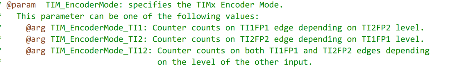 void TIM_EncoderInterfaceConfig(TIM_TypeDef* TIMx, uint16_t TIM_EncoderMode,