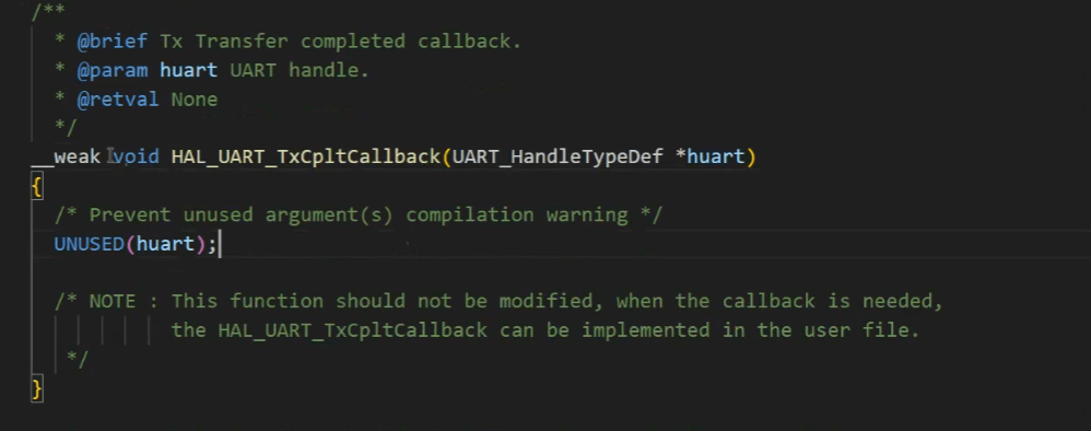 PS: void HAL_UART_RxCpliCallback(UART_HandleTypeDef *huart) 不要用成 void HAL_UART_TxCpliCallback(UART_HandleTypeDef *huart)