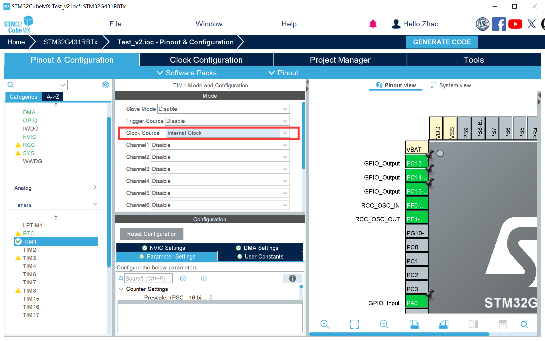 时钟源 (Clock Source):内部时钟意味着定时器使用微控制器内部的时钟源作为定时器的时间基准。通常,内部时钟是处理器的时钟或系统时钟(如