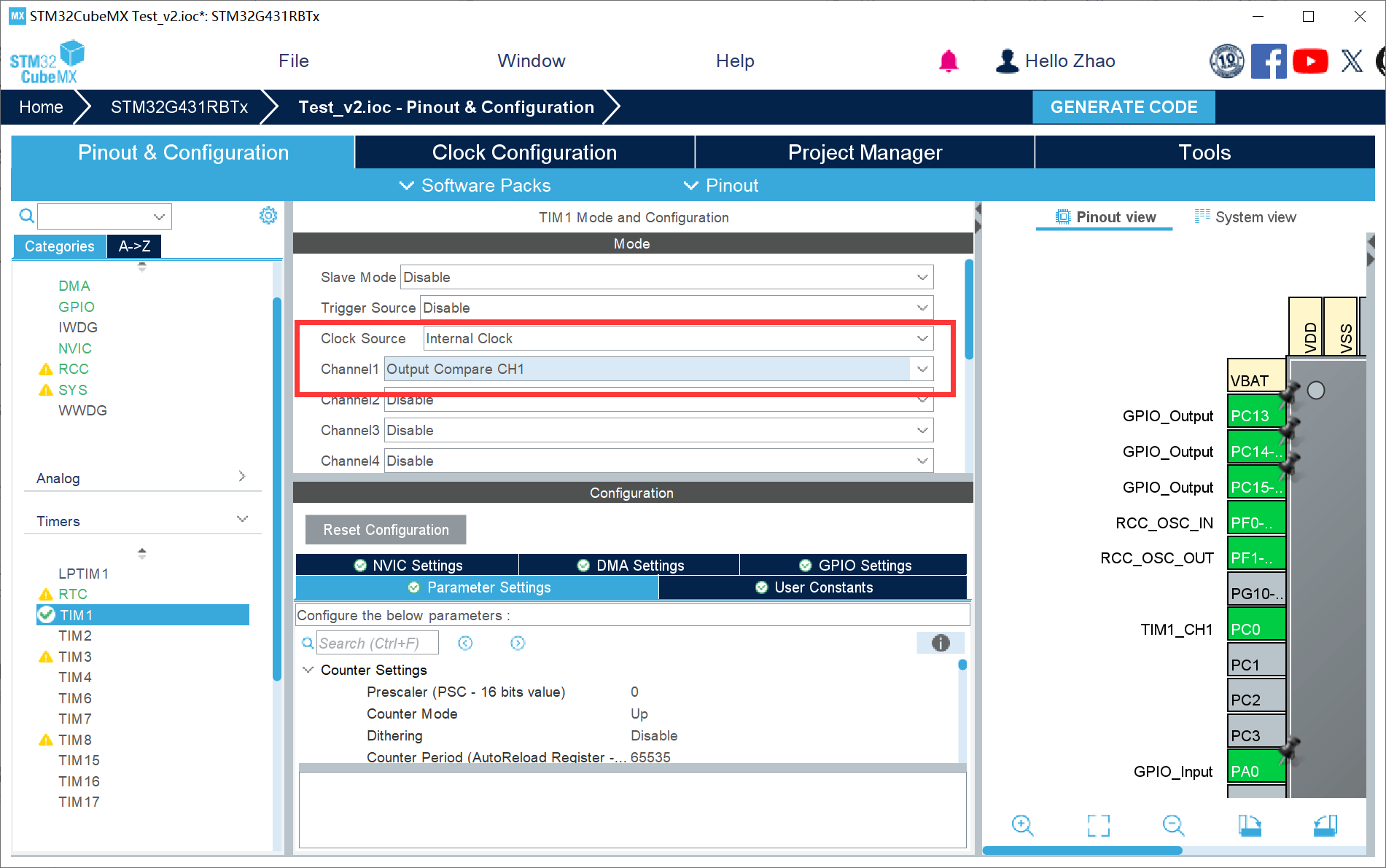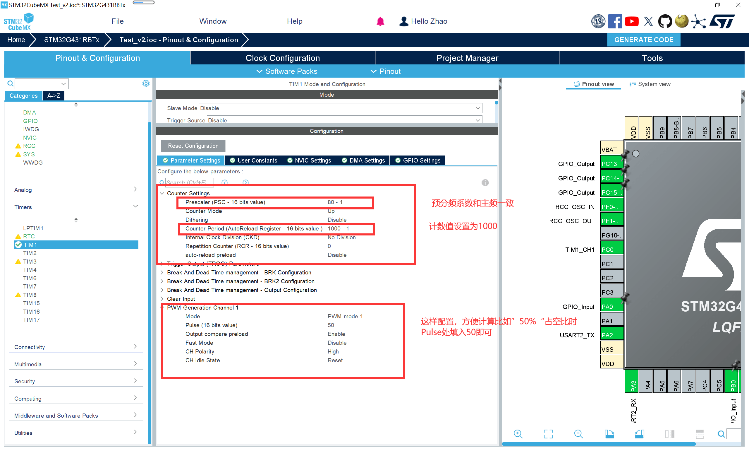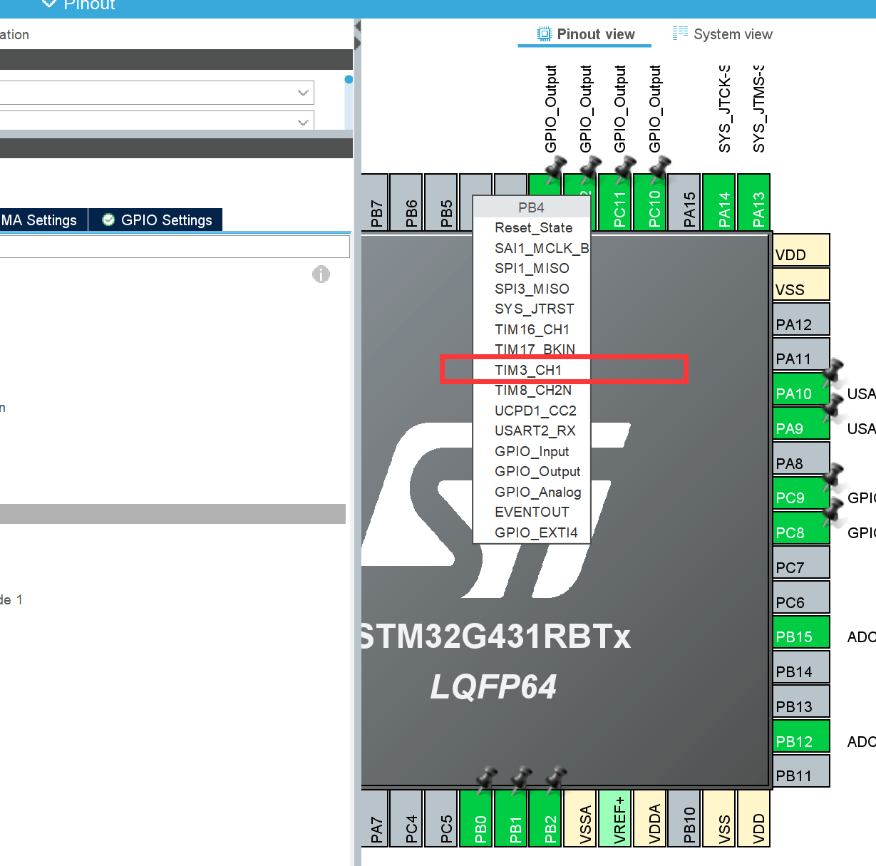 根据CubeMX的芯片引脚图,选中引脚后的相关外设提示,可以便捷的配置定时器的作用通道