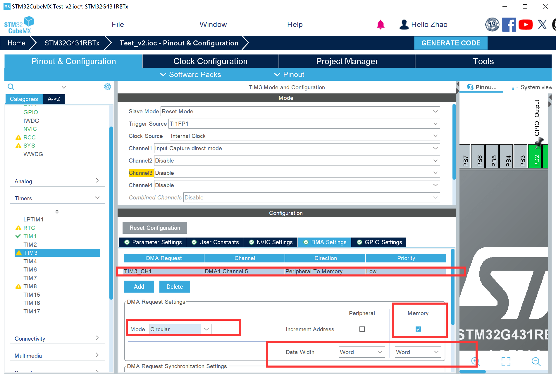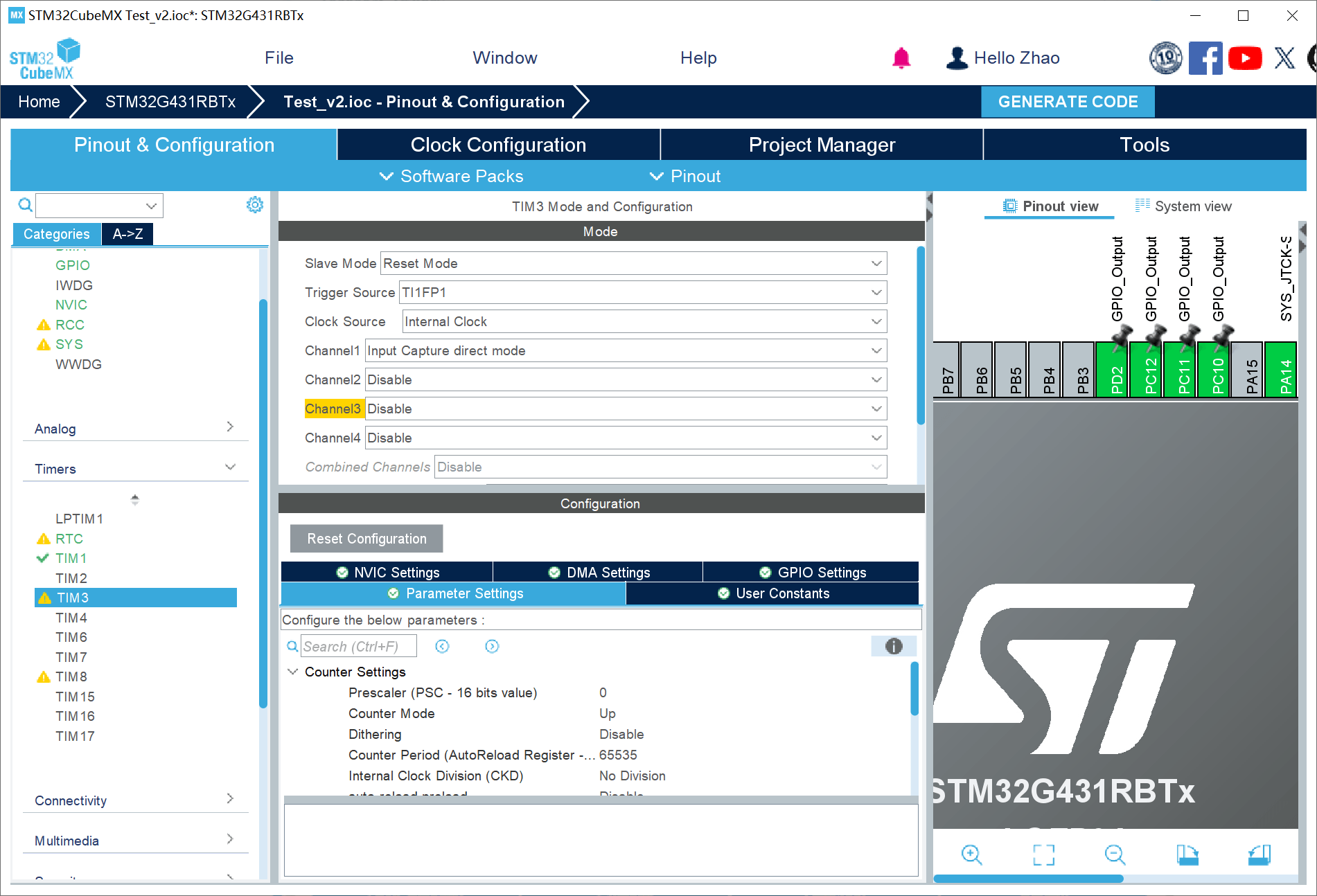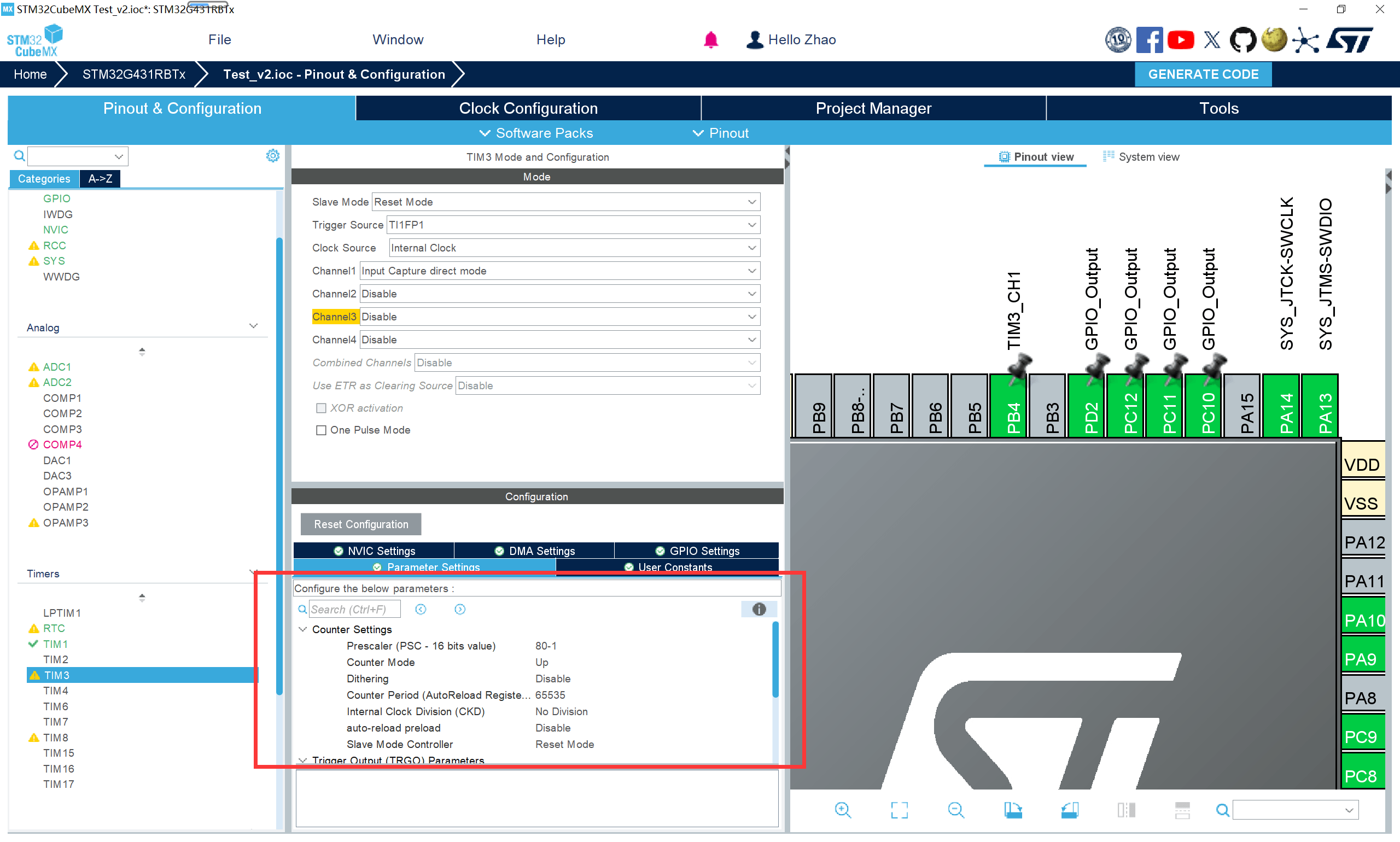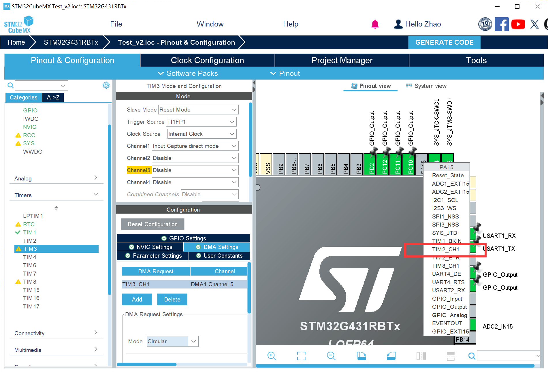 根据CubeMX的芯片引脚图,选中引脚后的相关外设提示,可以便捷的配置定时器的作用通道