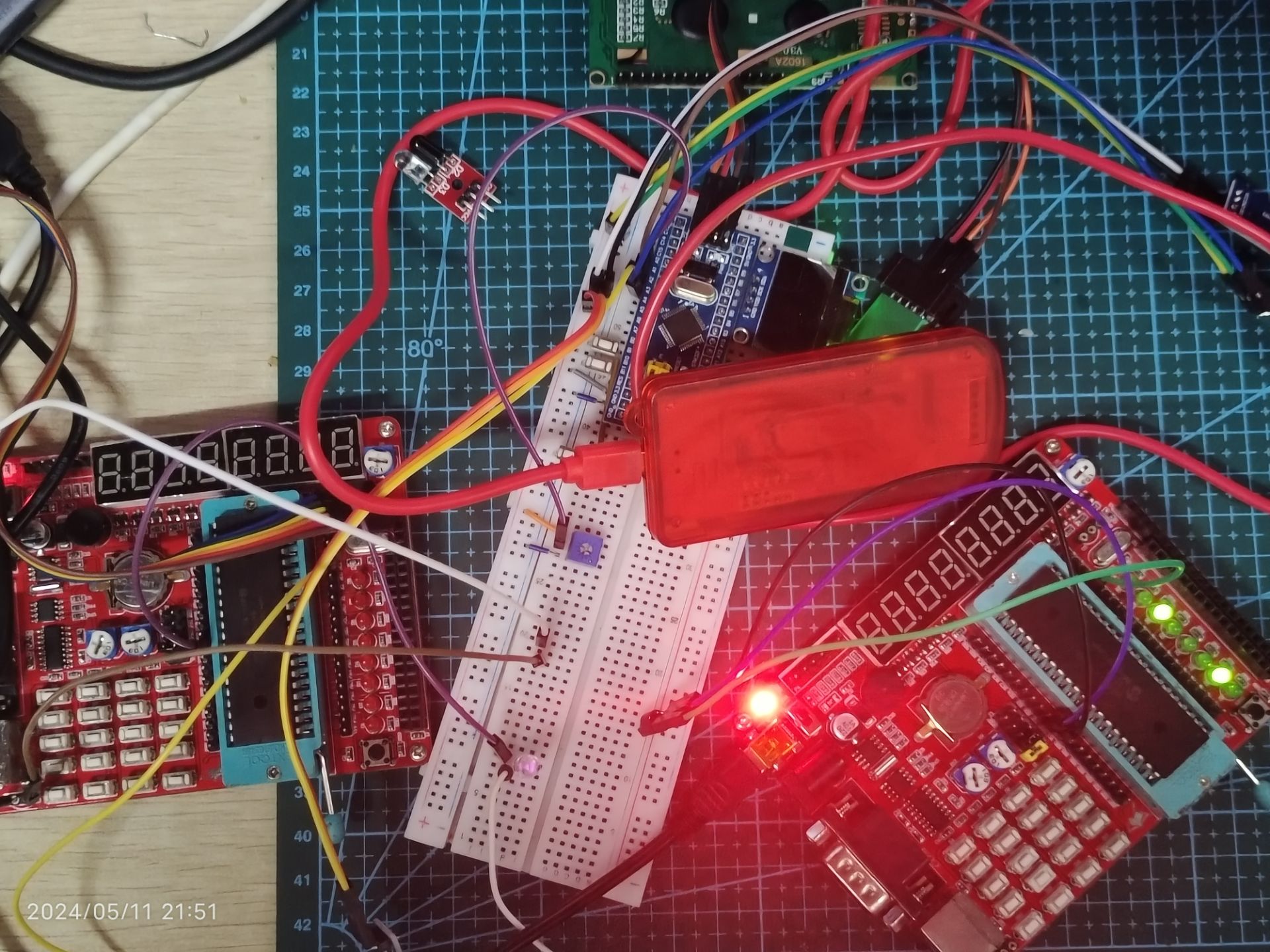 虽然在红外调制电路代码中,我们指定了每个二进制数据,停止位,起始位的电平长度,但是,因为程序设计以及单片机响应速度的原因,我们并不知道它最终生成信号各个部分的电平宽度具体值,如果将编写好的程序直接拿来用,可能得不到任何想要的现象。因此,要通过测量红外解调电路实际获取到的各个二进制电平的长度(通过LCD1602显示),然后再修改程序,使得红外接收单片机能够稳定接收红外发送单片机发送的信号。