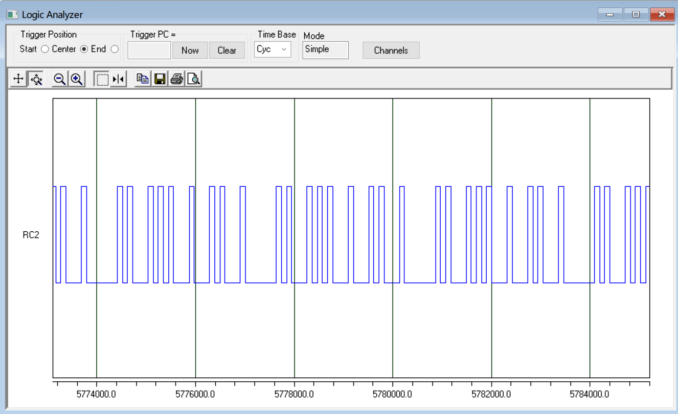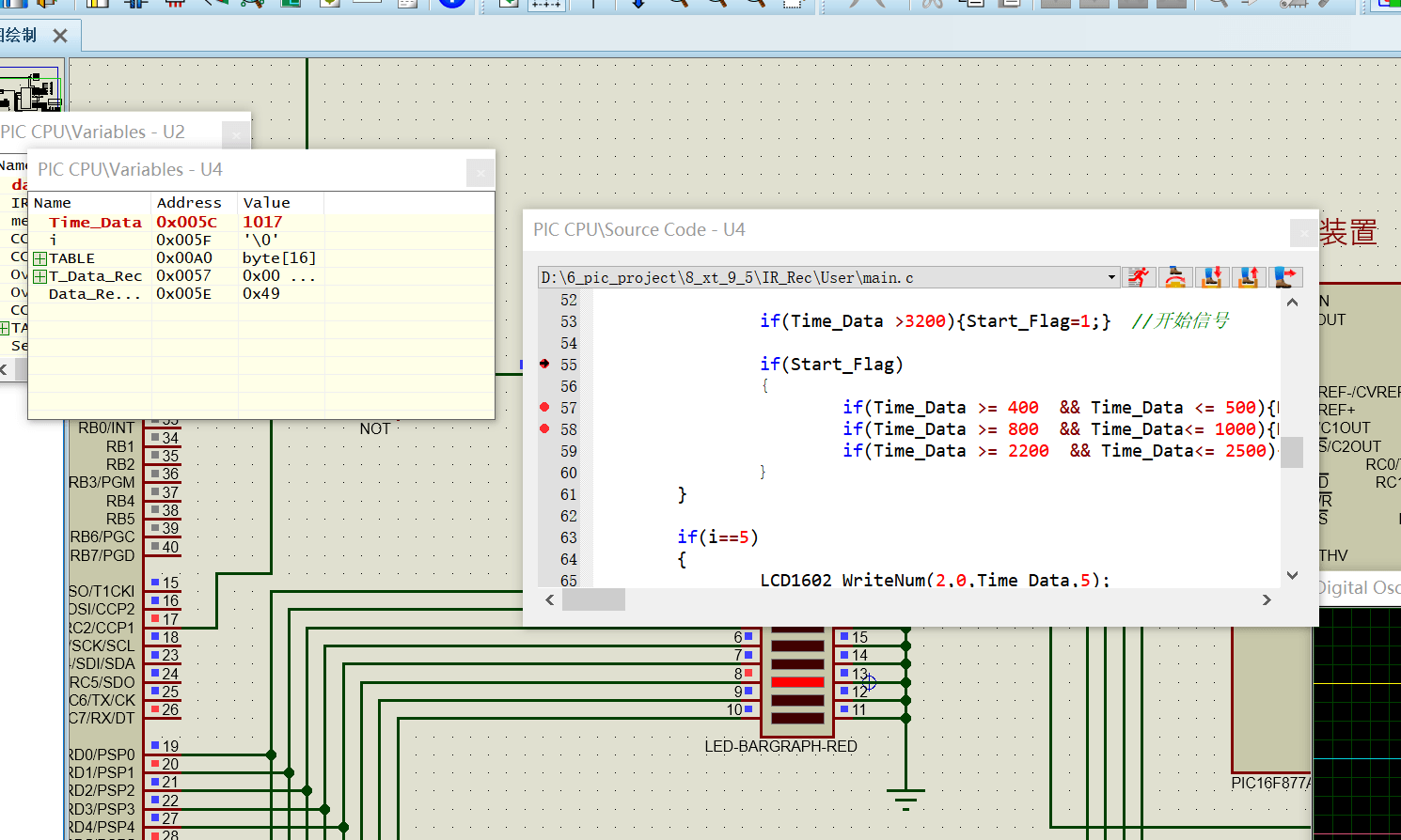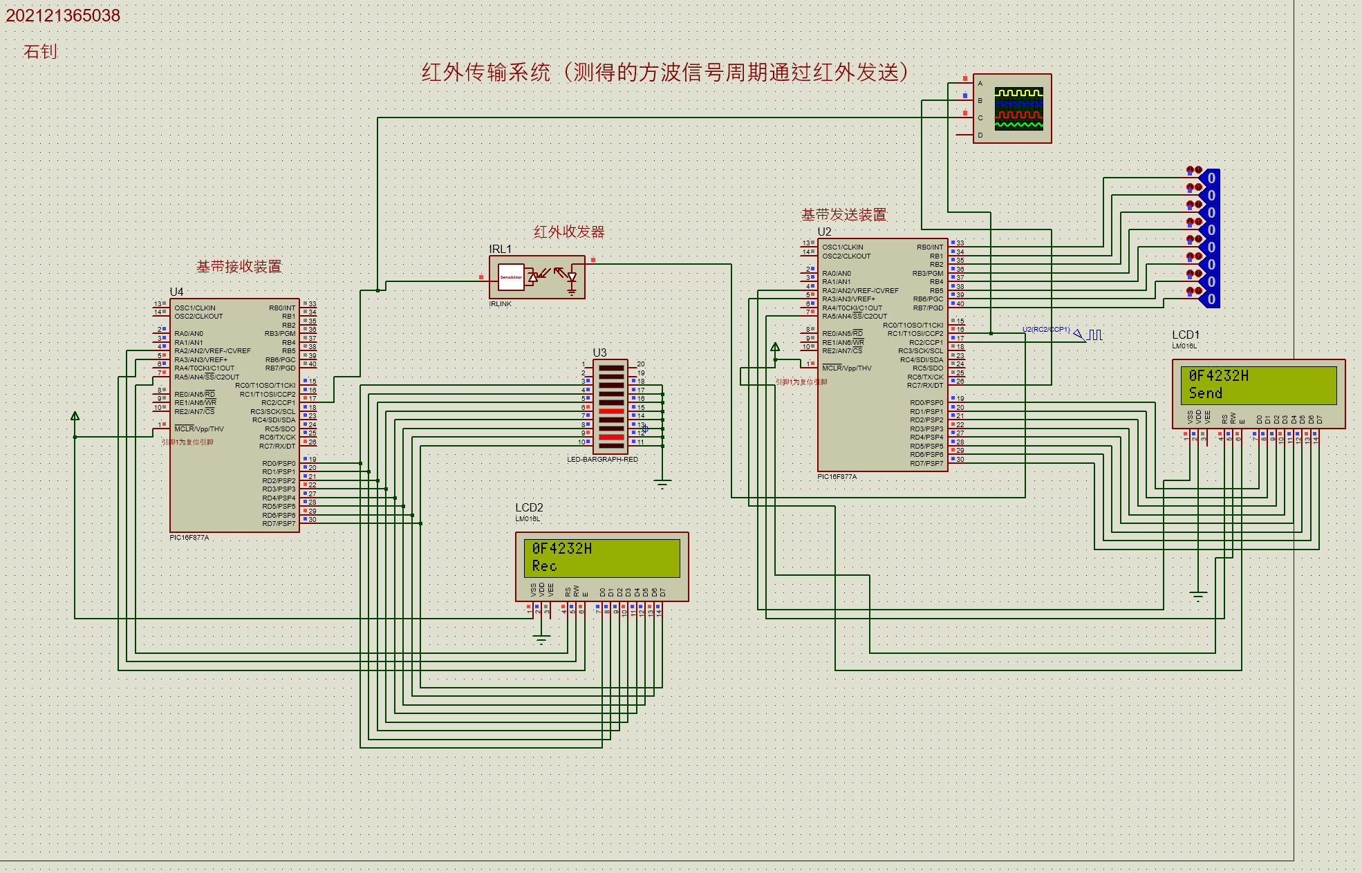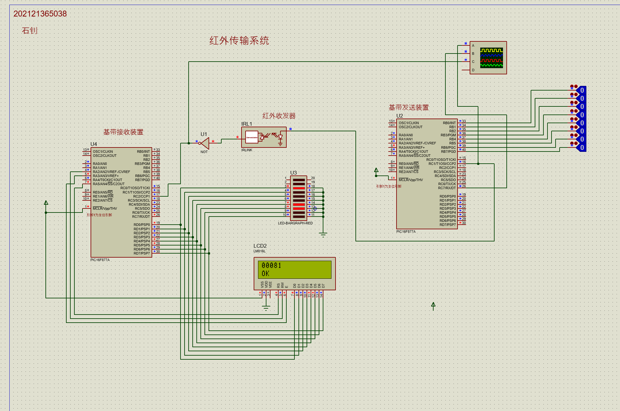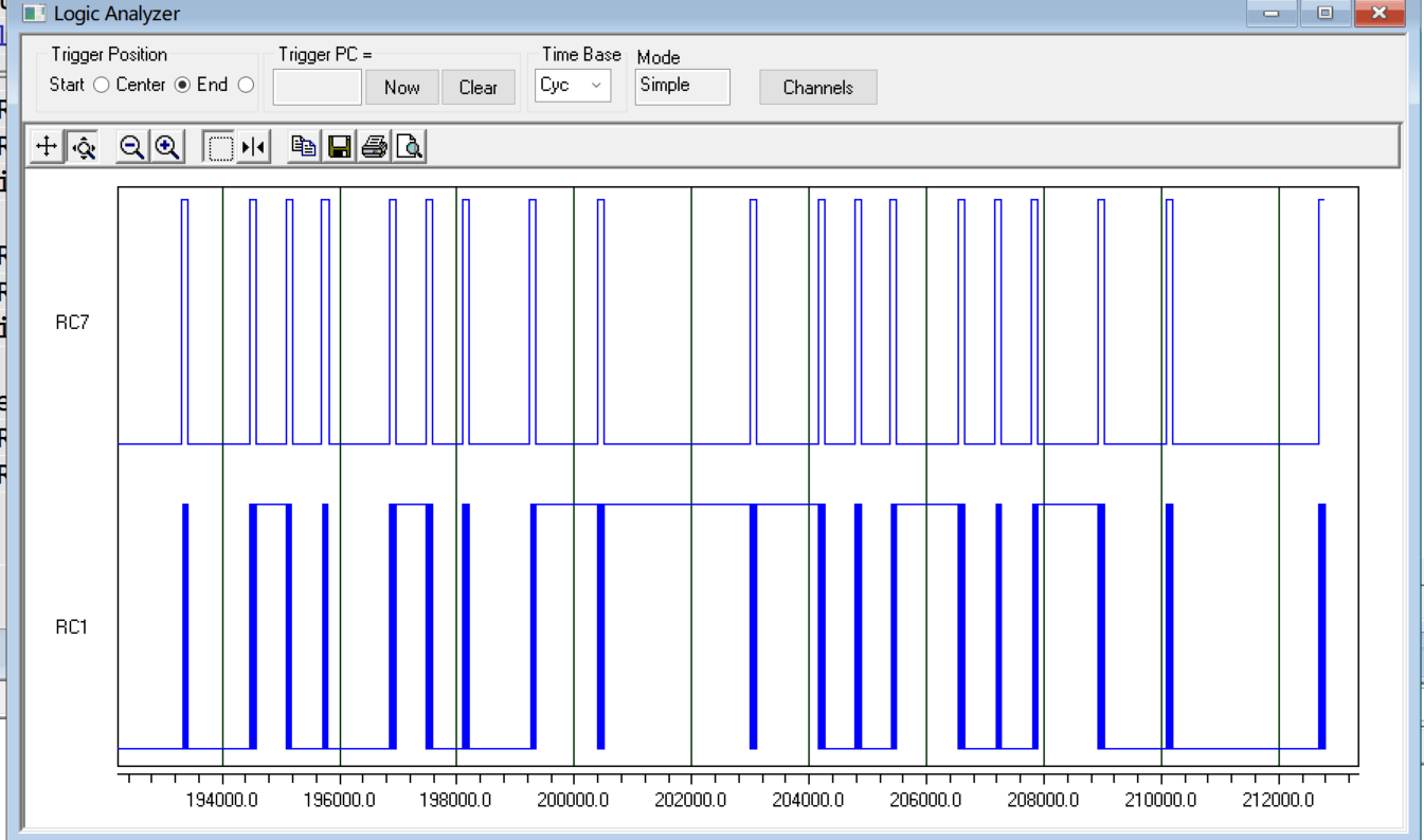 如图所示,因为RC2输出的红外基带信号带有毛刺,所以这里改为RC7引脚输出基带信号,这样,就能组成一个完整的红外发送-接收系统,运行仿真,此时红外接收端的LED同与发送端PORTB的逻辑