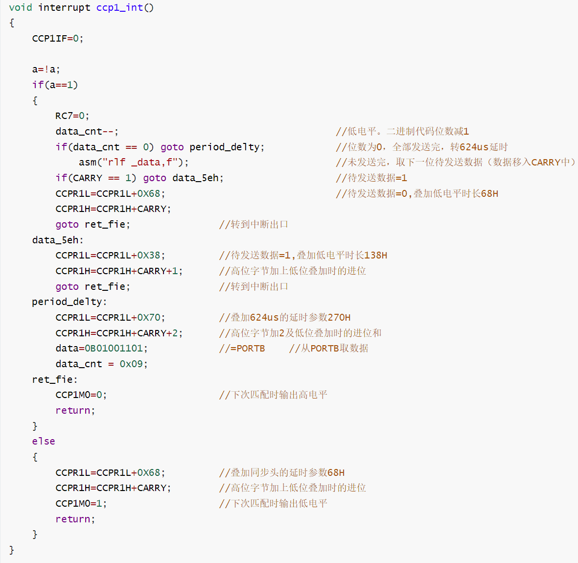 CCP1模块每次发送1位二进制的负脉冲宽度,每次循环从data左移一位。PIC单片机C语言循环移位语句用汇编语句asm(“rlf _data,f”),每次将最高位移入CARRY寄存器中,以最高的程序执行效率进行数据移位并生成基带信号的操作,并且每次发送1位二进制负脉冲宽度之后,会发送1位同步头的正脉冲宽度。发送完所有二进制数据之后,发送1位结束头低电平宽度